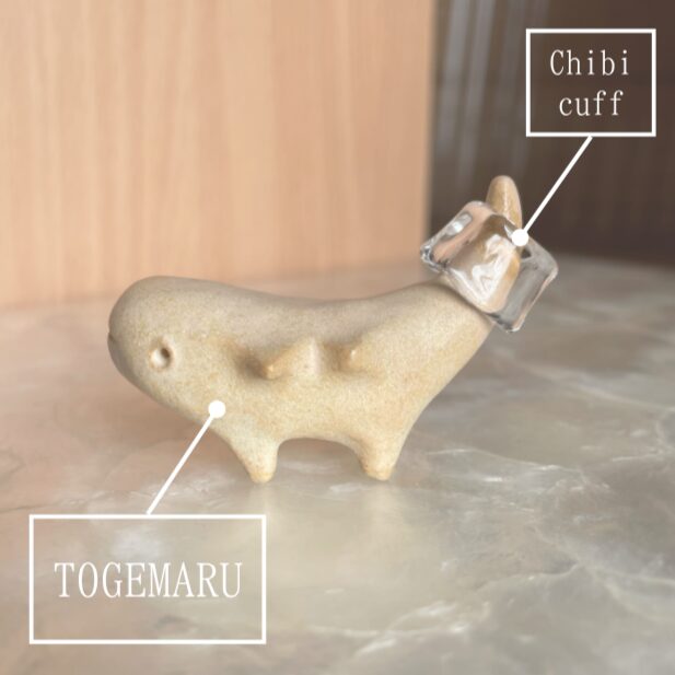 怪獣『とげまる』とガラスのイヤーカフ[ChiBi]- cuff の組み合わせ。しっぽにかかる透明な[ChiBi]- cuff はまるで『とげまる』の脱皮のよう。1匹、また1匹、、と手仕事で作る怪獣とイヤーカフは表情が様々で同じものは一つもありません°˖✧